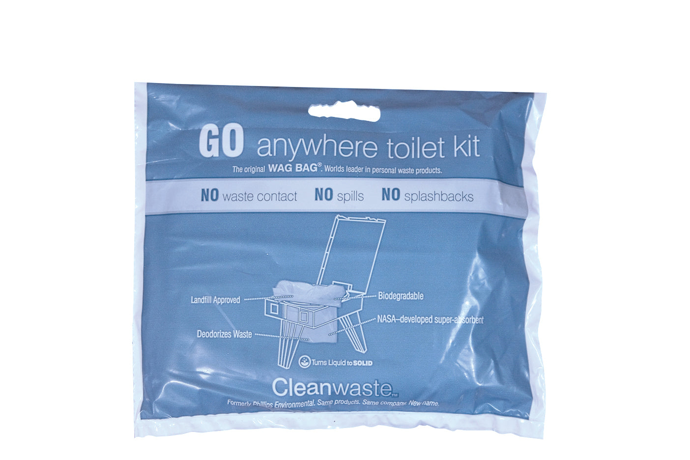 The Cleanwaste® GO Anywhere waste kit (formerly called the WAG BAG®) is a biodegradable double bag system made from puncture resistant materials. Each waste kit includes a zip close disposal.transport bag, a waste collection bag preloaded with Pooh Powder waste treatment, toilet paper and a hand sanitizer.